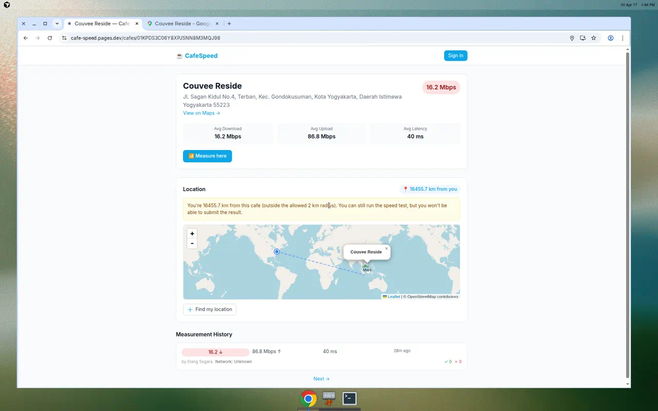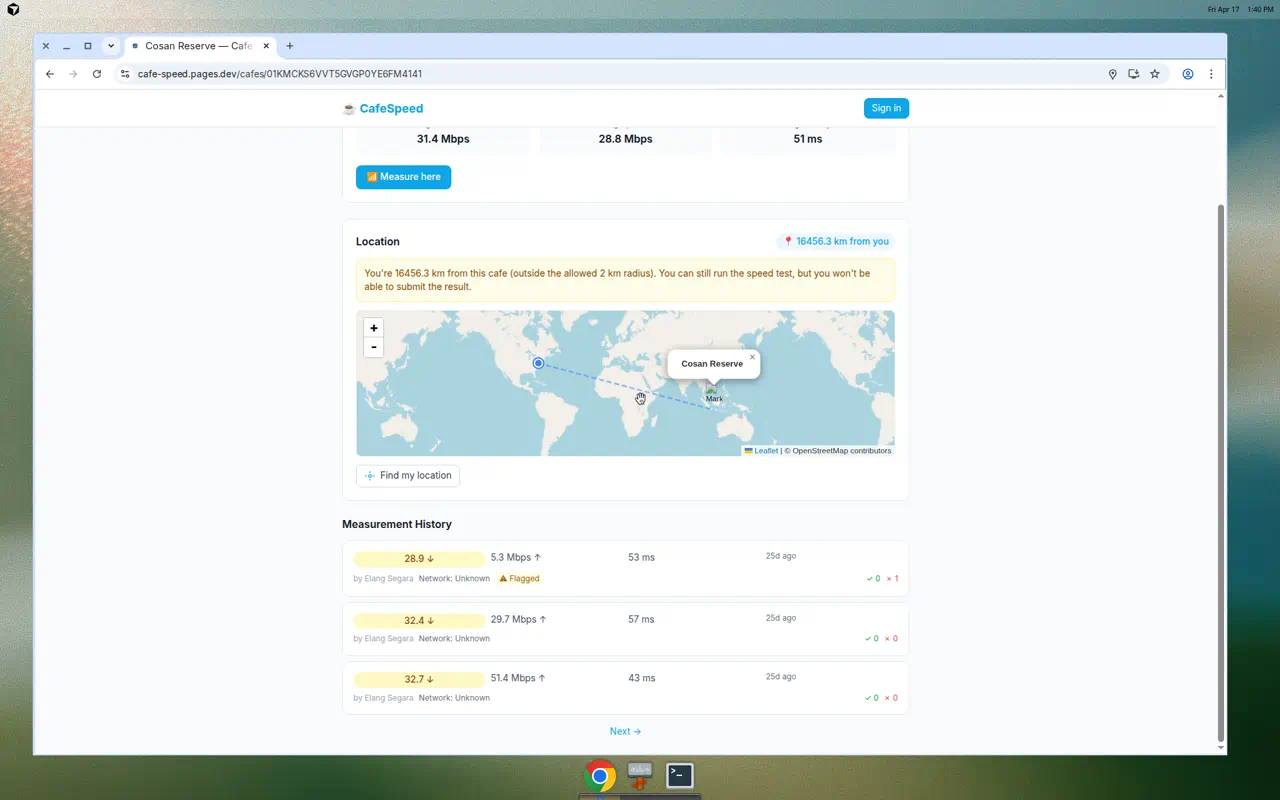 CafeSpeed enforces a 2-kilometer radius rule. The site automatically detects your location and calculates your distance from the cafe. If you’re outside the allowed radius, you can run the speedtest, but you won’t be able to submit the result.